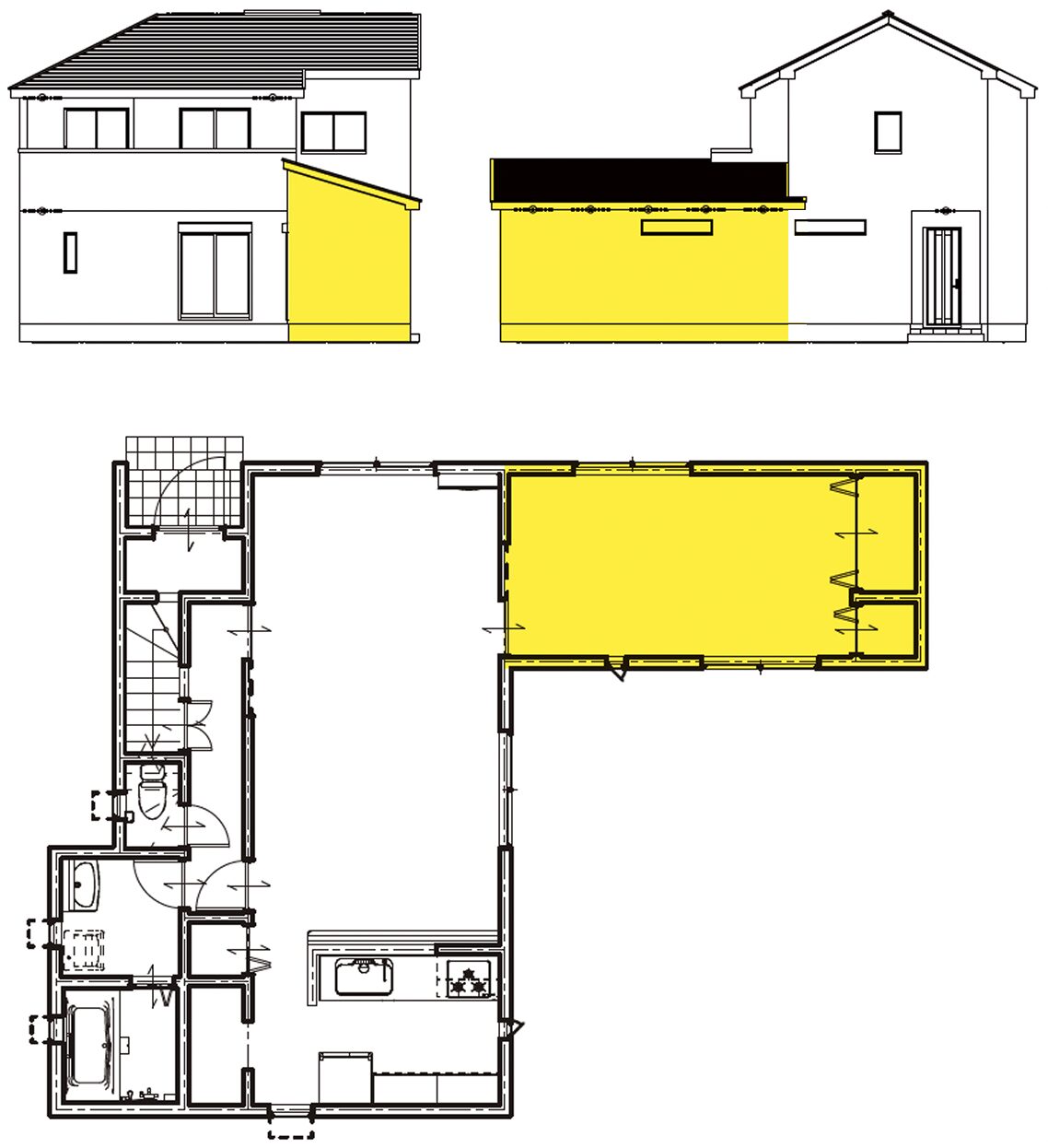 ※増築部分に新たな収納、ワークスペースなどを設け、ライフスタイルの変化に対応できる間取りとして提案