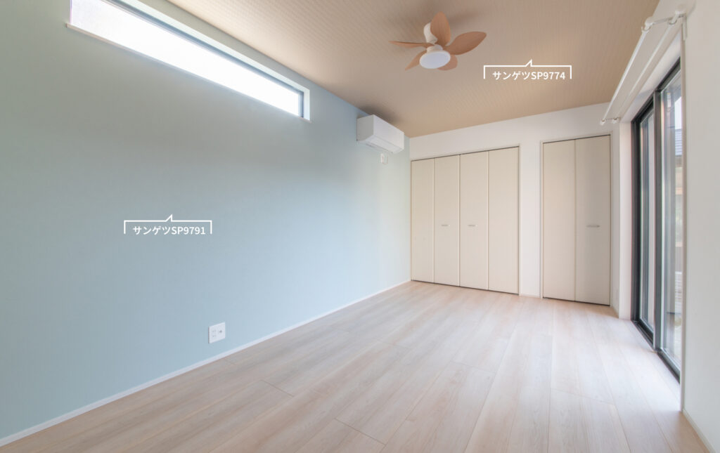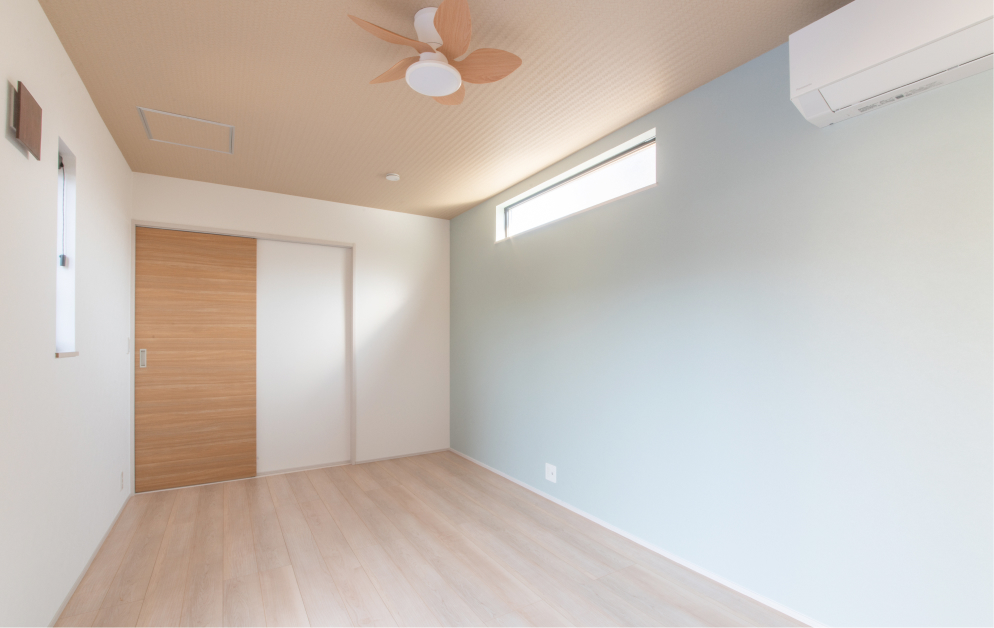 爽やかなペールブルーの壁と木目調の天井が、心地よい安らぎを生む プライベート空間。高い位置の窓とシーリングファンが光と空気を最適にコントロールし、デザイン性の高い引戸が空間をすっきりとまとめます。