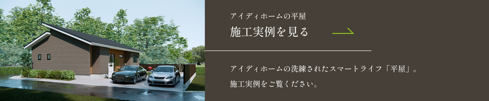 アイディホームの平屋 Single-story House トップページ 商品ラインナップ アイディホームの平屋 平屋で叶える、洗練のスマートライフ アイディホームがプロデュースする平屋は、日々の快適さと将来の安心を両立したこれからの「スマートライフ」を実現します。 ワンフロアに広がる快適動線 上下移動のない設計は、暮らしをシンプルにまとめます。 キッチン・洗濯室・収納が隣接し、家事効率も抜群。 毎日の家事をよりスムーズにするだけでなく、家族みんなの生活動線が スマートに。また、段差が少ないことにより、お子さまやシニアの方まで、 安心に移動できる環境が整います。 マンションのような暮らしやすさを戸建で叶える 地に近い安らぎや高さの負担がない安心構造は、平屋に暮らすうえで一番の魅力です。ワンフロアだから得られる、マンションのような利便性と暮らしやすさを、戸建住宅で叶えます。日々のメンテナンスがしやすい点も大きなメリットです。 技術が支える安心品質 戸建てからマンション・木造特殊建築まで、数多くの住まいを手がけてきた アイディホームの実績と技術力が、平屋の設計にも活かされています。 確かな施工品質と安心の構造計画により、長く快適に暮らせる住まいをお届けします。 将来を見据えたスマートな選択 様々なライフステージをデザインし、くらしに寄り添うことができる平屋は、 住まう家族の目的に、柔軟に応えることができます。 家族の未来をデザインできる、可能性と柔軟性のある住まいとして。 セカンドライフの充実と、安心して暮らせる老後を見据えた住まいとして。 アイディホームは、これからのご家族の人生を、住まいからご提案します。 アイディホームの平屋に関するお問い合わせはこちら 資料請求・店舗への来場を検討されている方は、下記よりお問い合わせください。 無料 資料請求 お近くの店舗を探す 商品に関するお問い合わせ 店舗一覧 商品ラインナップ 施工事例 アフターサポート
