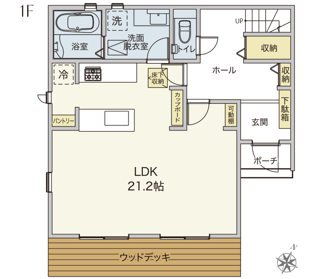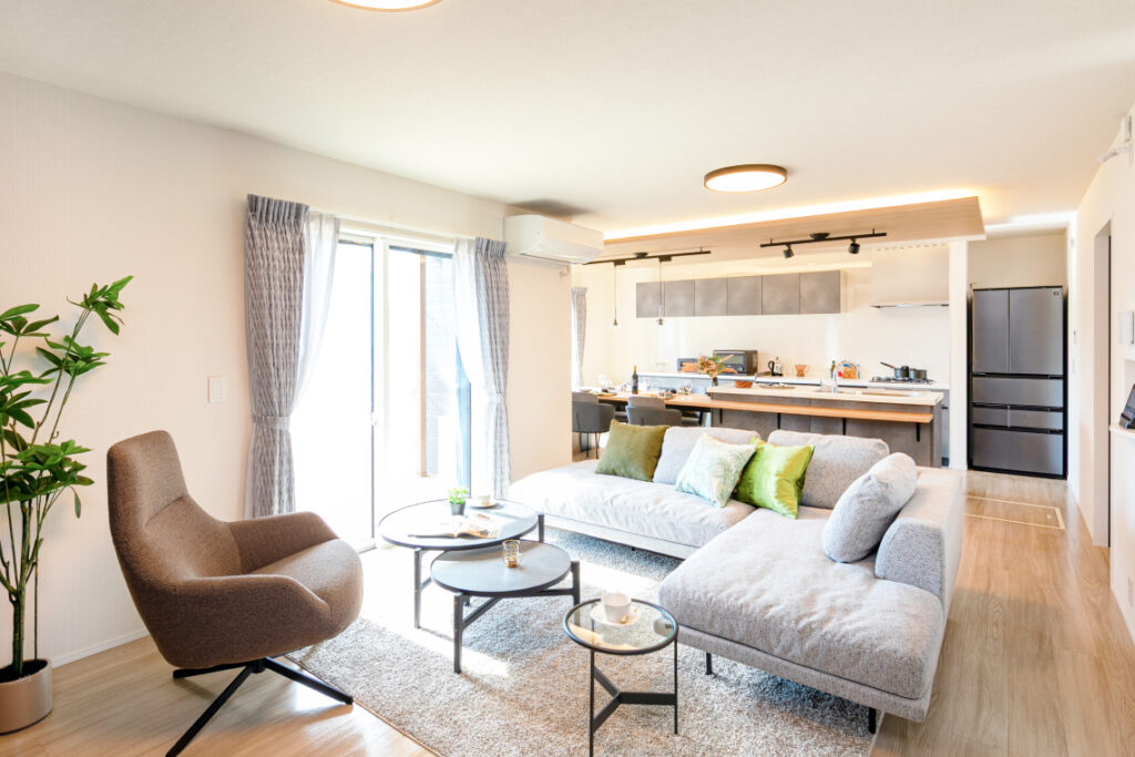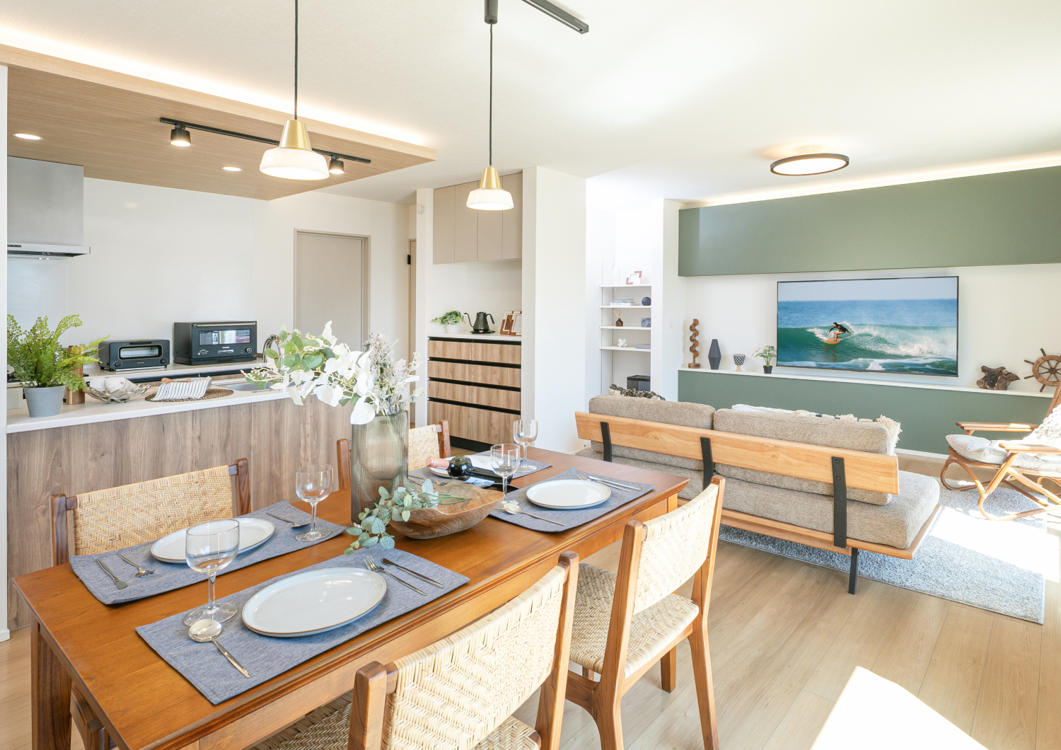 21.2帖のLDKに広がる、ゆとりの空間。食事の時間、くつろぎの時間、それぞれの過ごし方が自然に重なり合う設計です。同じ空間にいながらも、ちょうどいい距離感で過ごせる。家族の気配を感じながら、それぞれの時間を大切にできるレイアウトです。