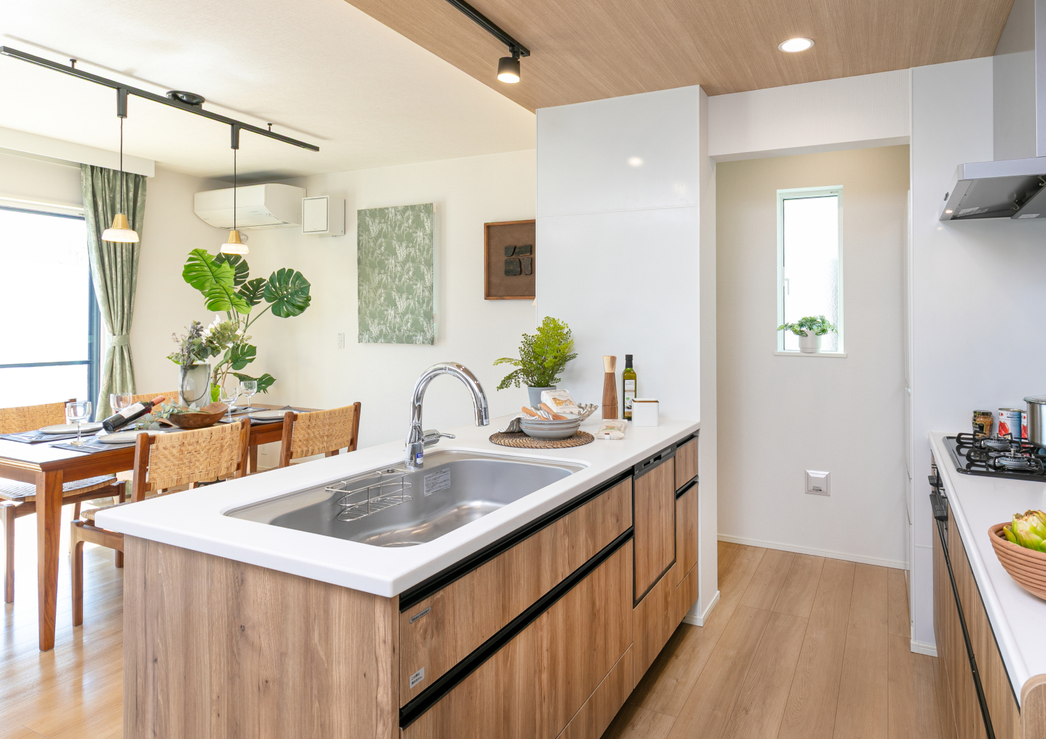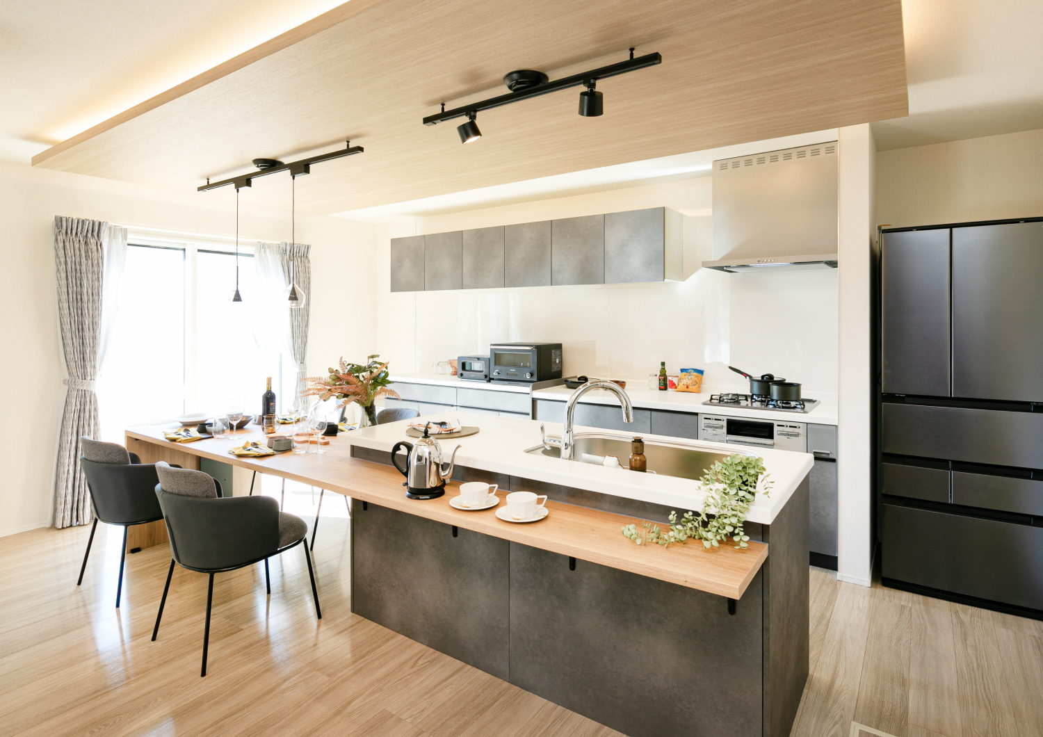 造作のダイニングテーブルを備えたキッチンなら、料理中もすぐそばで子どもたちの宿題を見守れます。横並びのスムーズな動線は自然とお手伝いのきっかけにも。視線の先には、リビングでくつろぐ家族の姿。こうした日常のひとコマが重なり合い、温かなコミュニケーションが育まれていきます。