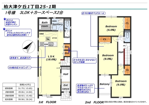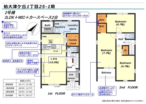 【長期優良住宅】カースペース並列2台!1号棟広々インナーバルコニー・2号棟ファミリークローゼット付き