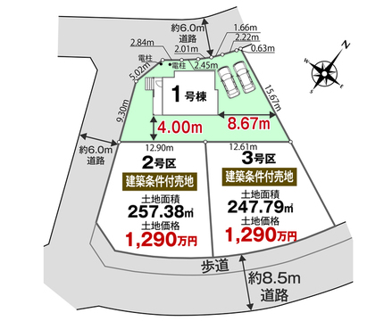 - 2区画 南:8.5m 西:6m 3区画 南:8.5m