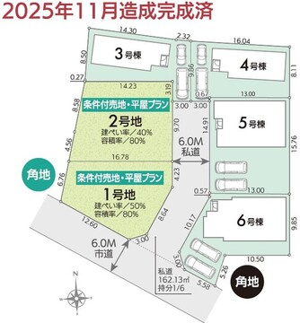 - 3号棟 南東:6m 4号棟 南東:6m 5号棟 南西:6m 6号棟 南:6m 西:6m