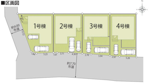 - 1号棟 南:7.7m 西:3.4m 2号棟 南:7.7m