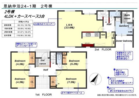 - 2号棟:【その他制限事項】建ぺい率:都市計画区域外のため規定無し(当該建築物の建蔽率です) 容積率:条例による制限 高さ制限13m以下 外壁後退50cm有り 土地面積に傾斜地部分(南側の花壇利用部分)約105平米含む カースペース4台可(車種による) 建物面積にインナーバルコニー約4.96平米含む ※詳細については担当営業店へお問合せください。また、現況と異なる場合は現況を優先させて頂きます